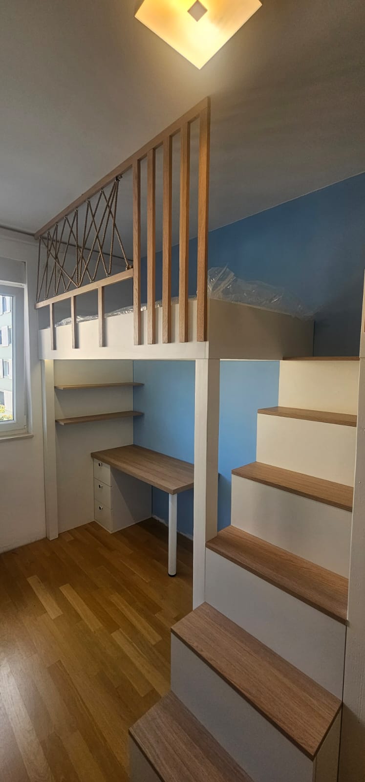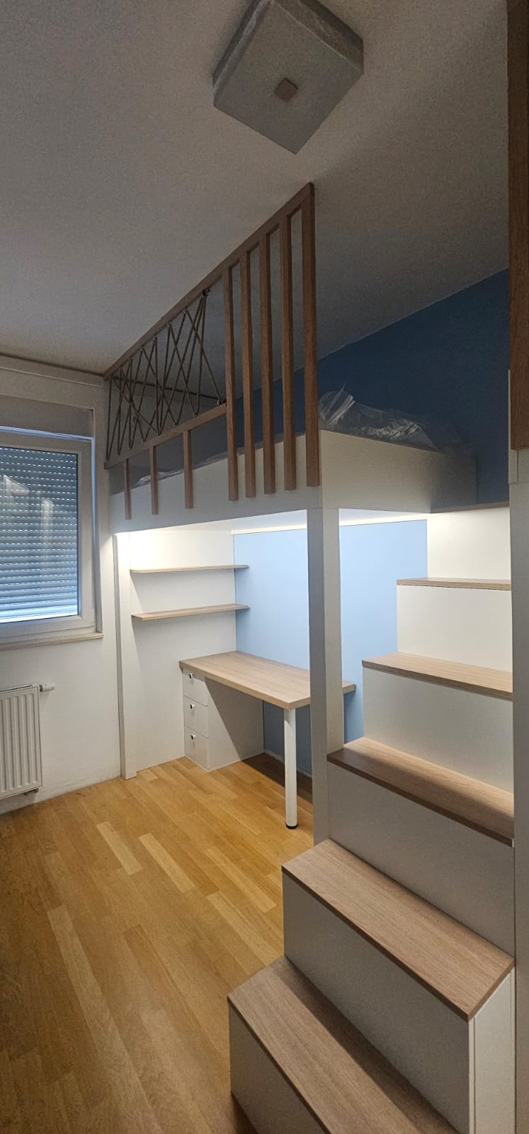 Već godinama stvaramo jedinstvene dječje sobe po mjeri koje se savršeno prilagođavaju svakom prostoru i osobnosti vašeg djeteta, koristeći samo najkvalitetnije i sigurne materijale za bezbrižno odrastanje. Svaka naša dječja soba je pažljivo osmišljena kako bi uključivala multifunkcionalne elemente – od kreativnih prostora za učenje i pisanje zadaće, preko zabavnih zona za igru s elementima poput penjalica, do ugodnih kutaka za opuštanje i odmor. Naš dizajn omogućuje da se prostor optimalno iskoristi i raste zajedno s vašim djetetom, stvarajući savršenu ravnotežu između praktičnosti, sigurnosti i zabave, što potvrđuju brojni zadovoljni roditelji diljem Zagreba i okolice.